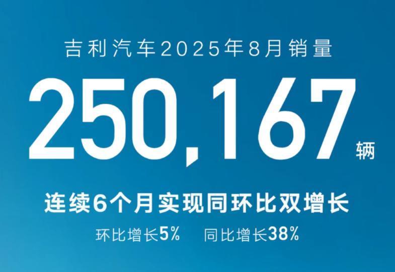 与上汽同为头部阵营的吉利汽车,8月销量同样表现抢眼,单月售出25.02万辆,同比增长38%,实现连续12个月单月销量突破20万辆。拉动吉利增长的核心动力来自新能源领域的“双线告捷”。其中纯电动汽车8月销量9.34万辆,同比激增98%;插电式混动汽车销量5.40万辆,同比增长90%,两大品类增速均远超行业平均水平,成为整体销量的“主引擎”。
