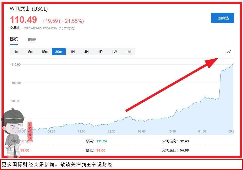 布伦特原油期货盘中一举冲破110美元/桶整数关口,最高摸到111.7美元;美国WIT原油更是暴涨20%,也突破110美元,最高112美元。